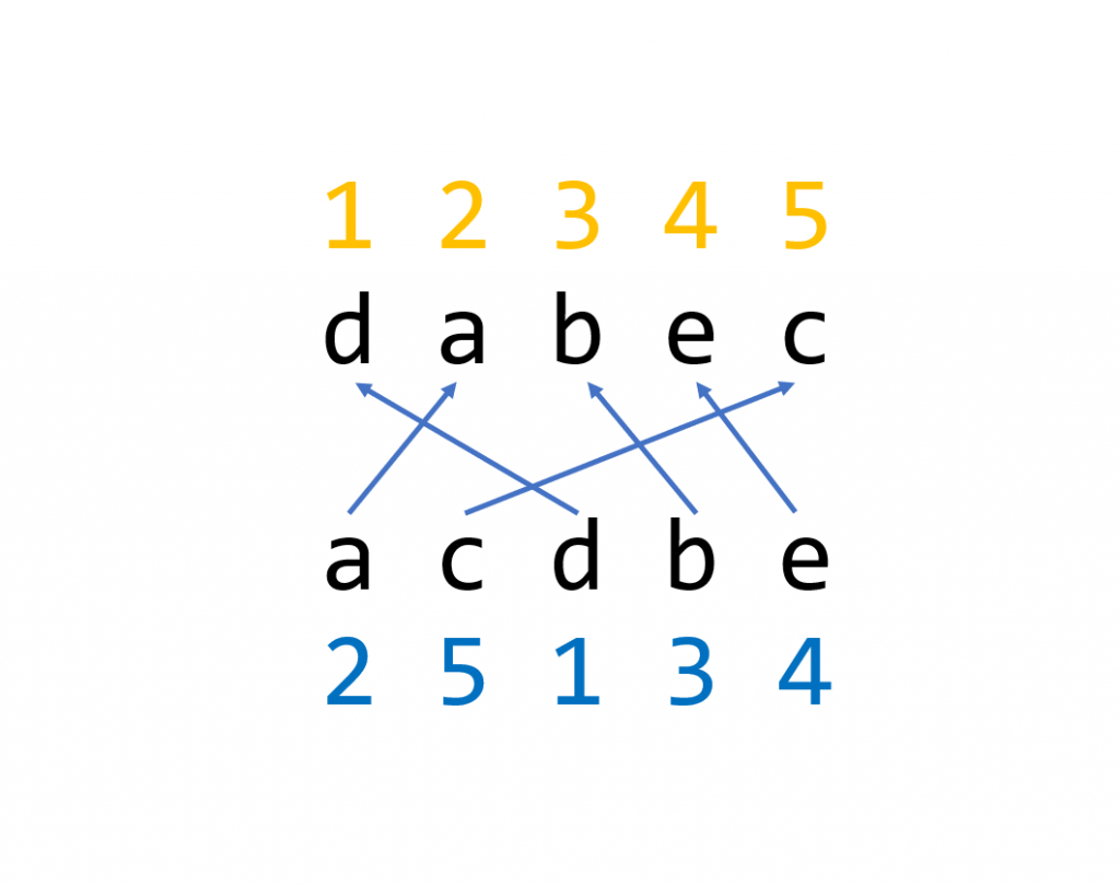 对于下面两个序列 a = {a, d, c, e, b} 和 b = {a, c, d, b, e} 来说,我们将序列 b 做一个映射,将 b 中的值修改为 a 中对应数值的下标