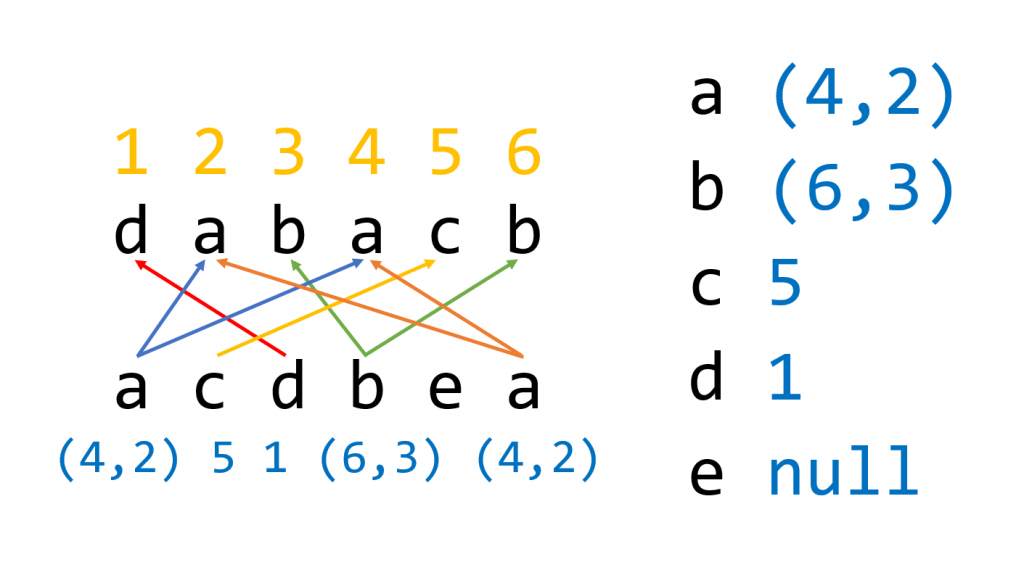 而对于有重复数值的序列,我们只要将它出现的位置递减排列,填入到每一个出现的位置即可;对于没有在另一个序列中出现的数值,我们直接不对其进行映射