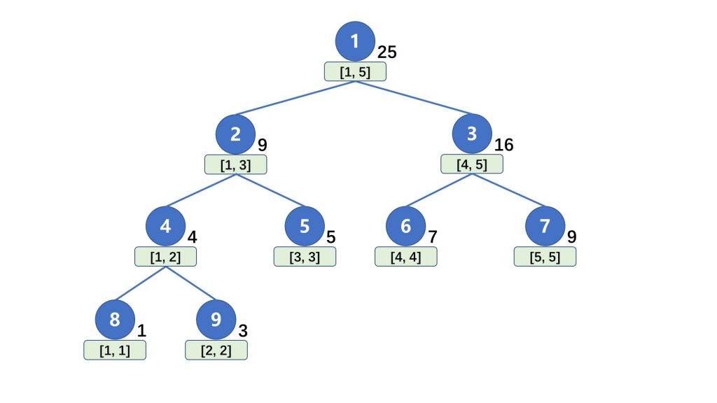 我们使用一个 $tree[\ ]$ 数组来保存线段树,设根节点的编号为 $1$ ,那么对于树中的节点 $p$ ,它的左右孩子分别是 $2p$ 和 $2p + 1$。当节点 $p$ 存储区间 $[l, r]$ 的和时,设 $mid = \dfrac{l+r}{2}$ ,那么节点 $2p$ 存储的是区间 $[l, mid]$ 的和,节点 $2p+1$ 存储的是区间 $[mid + 1, r]$ 的和
