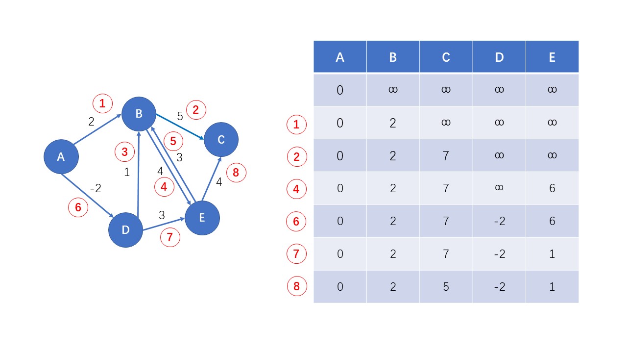 上图为 Bellman-Ford 算法执行完成第一次循环时的结果,之后循环参考第一轮循环
