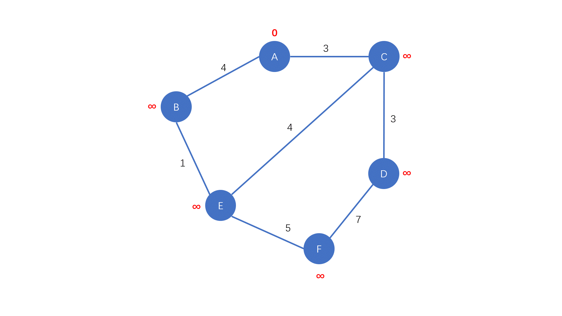初始时我们将除 起点 外的所有点都归入 未确定最短路长度的点的集合中,并且初始化距离数组 $dis[start] = 0$,其余点均为 $+\infty$