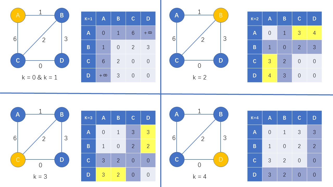 dis[k][x][y] = min(dis[k-1][x][y],dis[k-1][x][k] + dis[k-1][k][y]),dis[k-1][x][y] 为不经过 $k$ 点的最短路径;而 dis[k-1][x][k] + dis[k-1][k][y] 为经过 $k$ 点的最短路,求出它们两个中较小的那个即为允许经过点 $1-k$ 时的最短路长度
